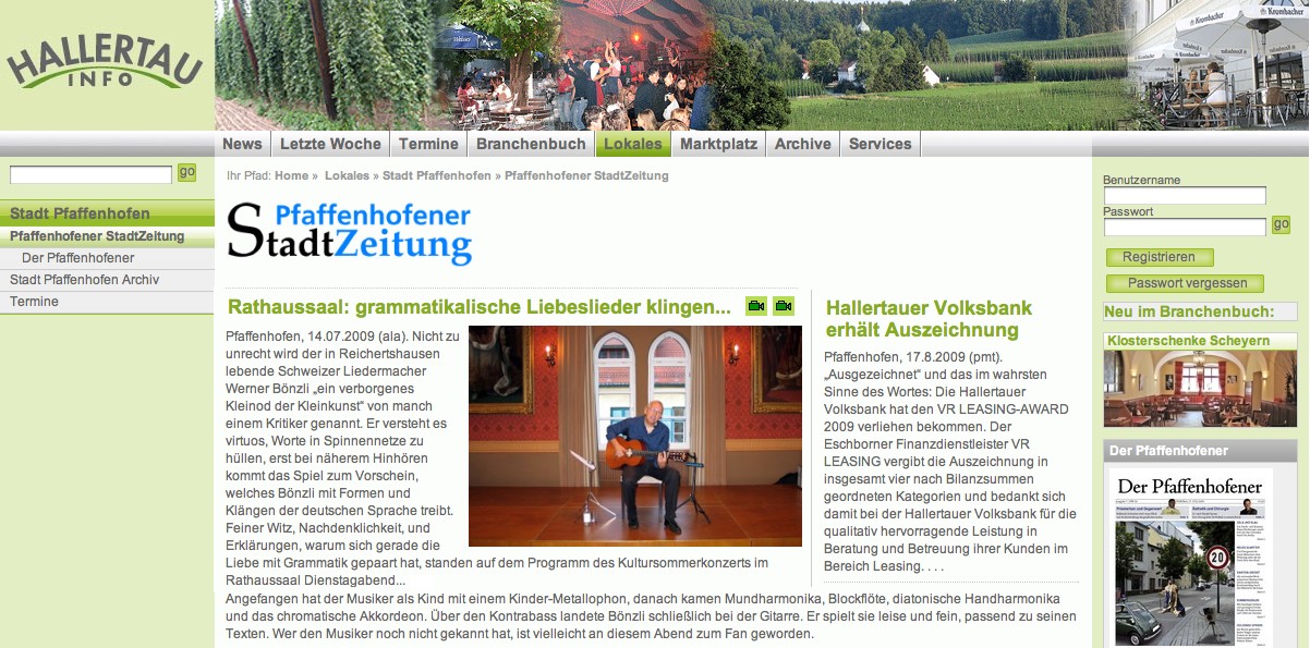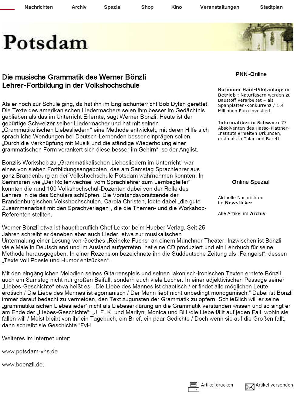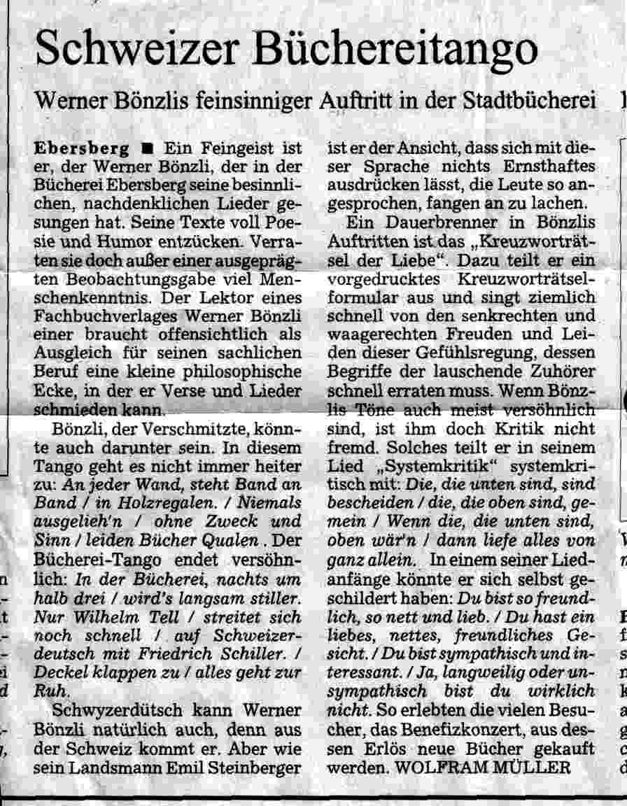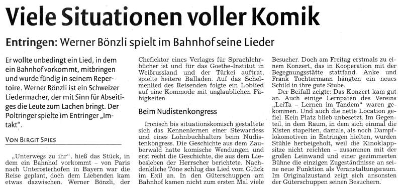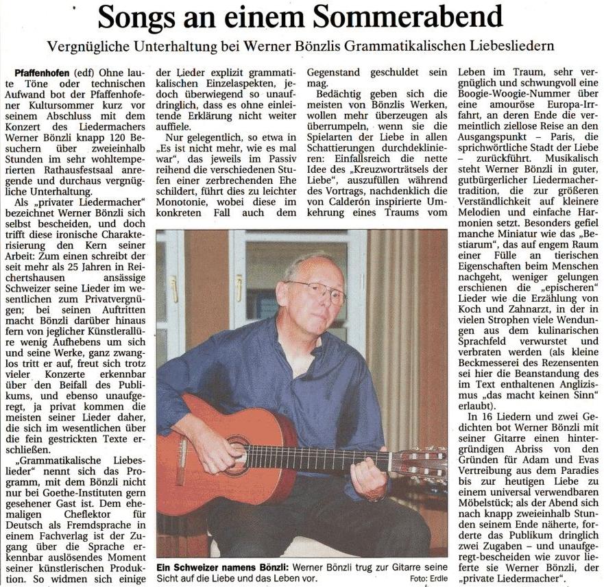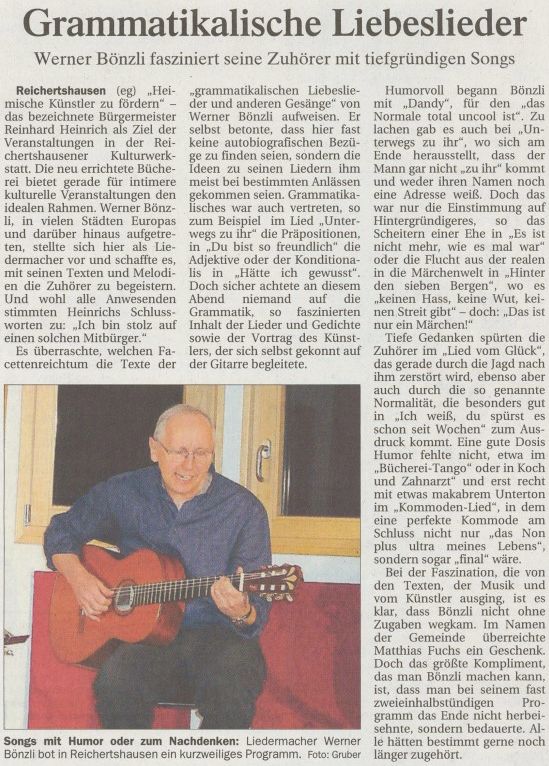 Mit den eingänglichen Melodien seines Gitarrenspiels und seinen lakonisch-ironischen Texten erntete Bönzli auch am Samstag nicht nur großen Beifall, sondern auch viele Lacher. [ ] Dabei ist Bönzli immer darauf bedacht zu vermeiden, den Text zugunsten der Grammatik zu opfern. Schließlich will er seine „grammatikalischen Liebeslieder“ nicht als Liebeserklärung an die Grammatik verstanden wissen |