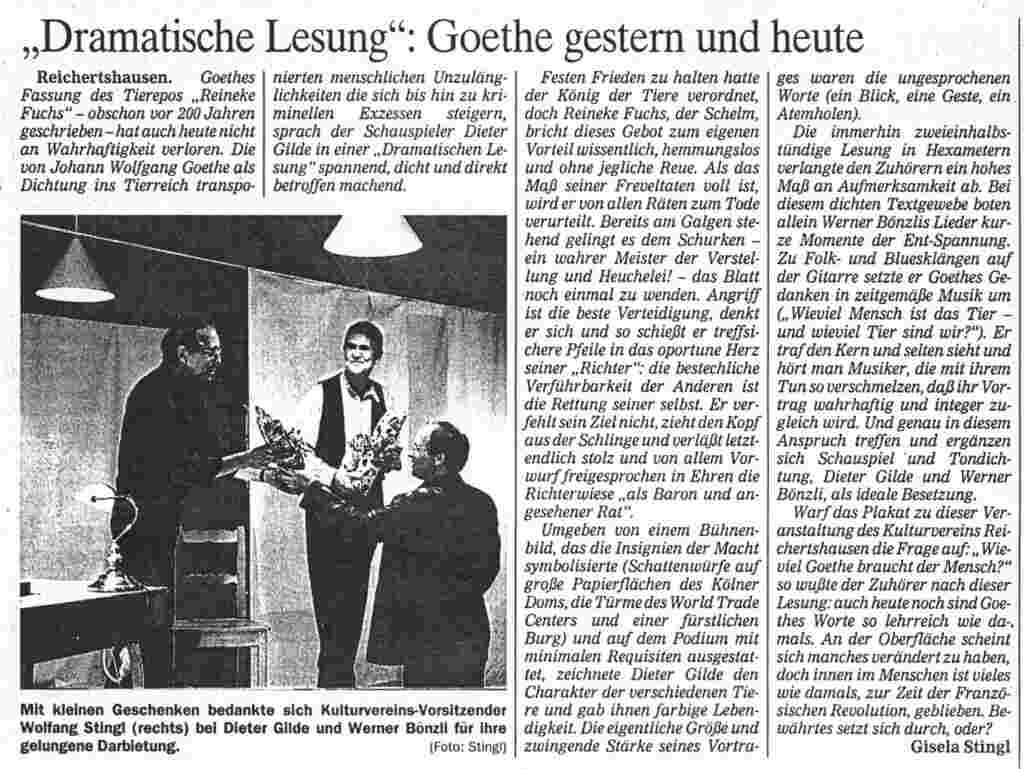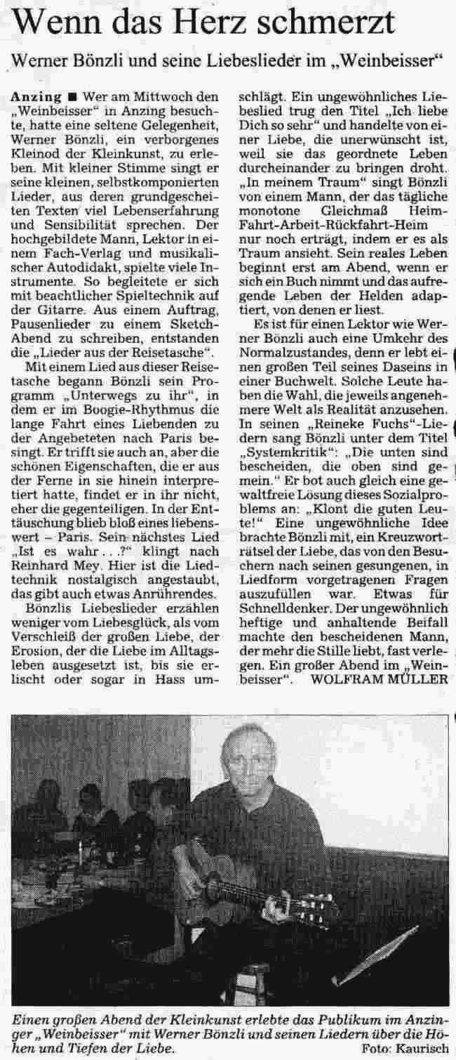 Bei diesem dichten Textgewebe boten allein Werner Bönzlis Lieder kurze Momente der Ent-Spannung. Er traf den Kern und selten sieht und hört man Musiker, die mit ihrem Tun so verschmelzen, daß ihr Vortrag wahrhaftig und integer zugleich wird |