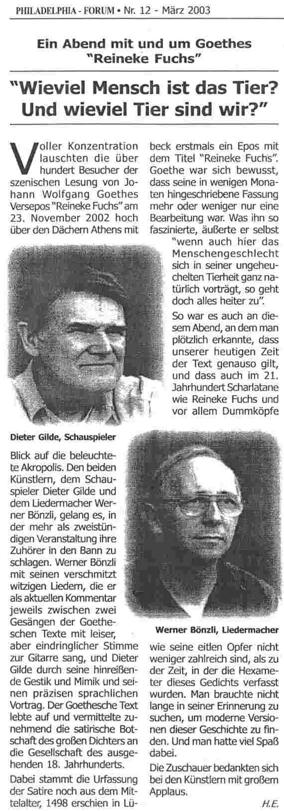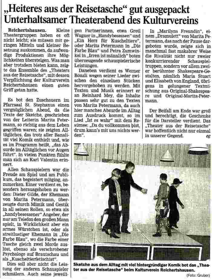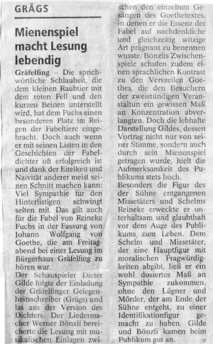 Daneben verdient es Werner Bönzli wegen seiner Lieder zwischen den einzelnen Stücken hervorgehoben zu werden. Mit Texten und Musik erinnert er an Reinhard Mey |