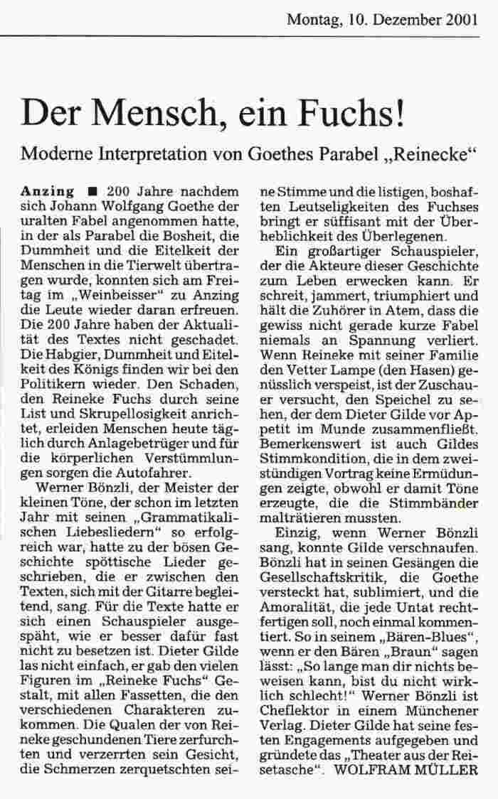 Werner Bönzli, der Meister der kleinen Töne, der schon im letzten Jahr mit seinen Grammatikalischen Liebesliedern so erfolgreich war, hatte zu der bösen Geschichte spöttische Lieder geschrieben, die er zwischen den Texten, sich mit der Gitarre begleitend, sang |