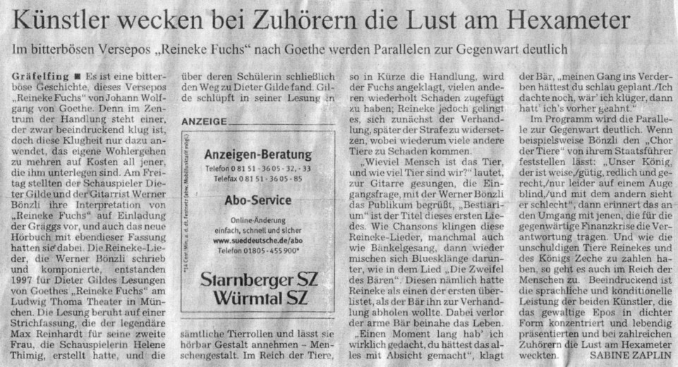 Der Liedermacher Werner Bönzli bereicherte die Lesung mit musikalischen Einlagen zwischen den einzelnen Gesängen des Goethetextes, in denen er die Essenz der Fabel auf nachdenkliche und gleichzeitig witzige Art prägnant zu benennen wusste |